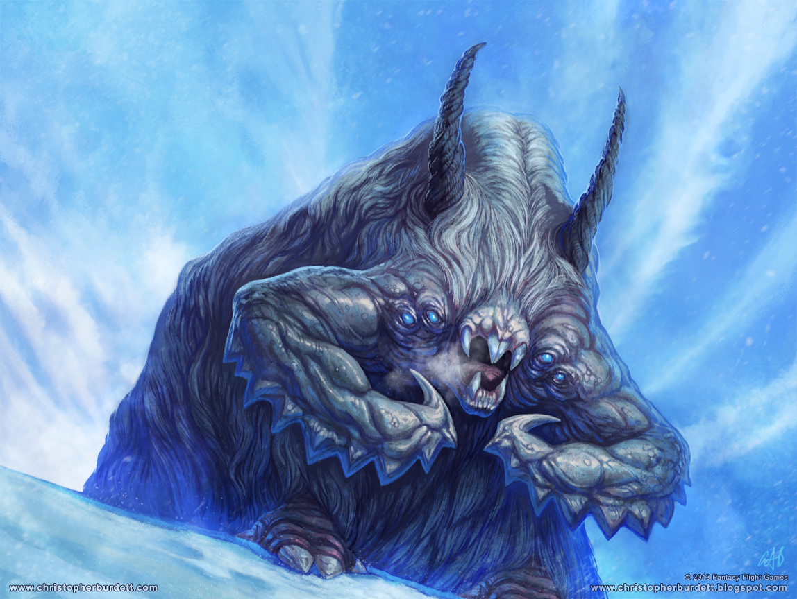 My first 100 original Dungeons & Dragons Monster Manual redesigns (A - Z): Aerial Servant, Ankheg, Ant (Giant), Ape (Carnivorous), Ape (Gorilla), Axe Beak, Axe Beak (version 2), Baboon, Badger, Barracuda, Basilisk, Baluchitherium, Bear (Black), Bear (Brown), Bear (Cave), Beaver (Giant), Beetle (Giant) - Bombardier, Beetle (Giant) - Boring, Beetle (Giant) - Fire, Beetle (Giant) - Rhinoceros, Beetle (Giant) - Stag, Beetle (Giant) - Water, Beholder, Black Pudding, Blink Dog, Boar (Giant), Boar (Warthog), Boar (Wild), Brain Mole, Brownie, Bugbear, Buffalo, Bulette, Carrion Crawler, Catoblepas, Cerebral Parasite, Chimera, Cockatrice, Coutal, Crab (Giant), Demon Type III (Glabrezu), Demon (Juiblex), Demon (Manes), Devil (Ice), Dragon (Red), Elemental (Earth), Ettin, Eye of the Deep, Flightless Bird, Frog (Giant), Fungi (Violet), Giant (Hill), Goblin, Golem (Flesh), Hobgoblin, Homunculus, Hydra, Imp, Intellect Devourer, Ixitxachitl, Jackal, Jacklewere, Jaguar, Ki-Rin, Kobold, Lich, Lizard (Giant), Lizardman, Manticore, Mind Flayer, Minotaur, Naga, Neo-Otygugh, Nixie, Ochre Jelly, Ogre, Owlbear, Peryton, Pixie, Purple Worm, Quasit, Ram (Giant), Roper, Rust Monster, Sahuagin, Salamander, Shambling Mound, Treant, Troglodyte, Troll, Umber Hulk, Unicorn, Vampire, Wasp (Giant), Wight, Wyvern, Xorn, Yeti, and Zombie.