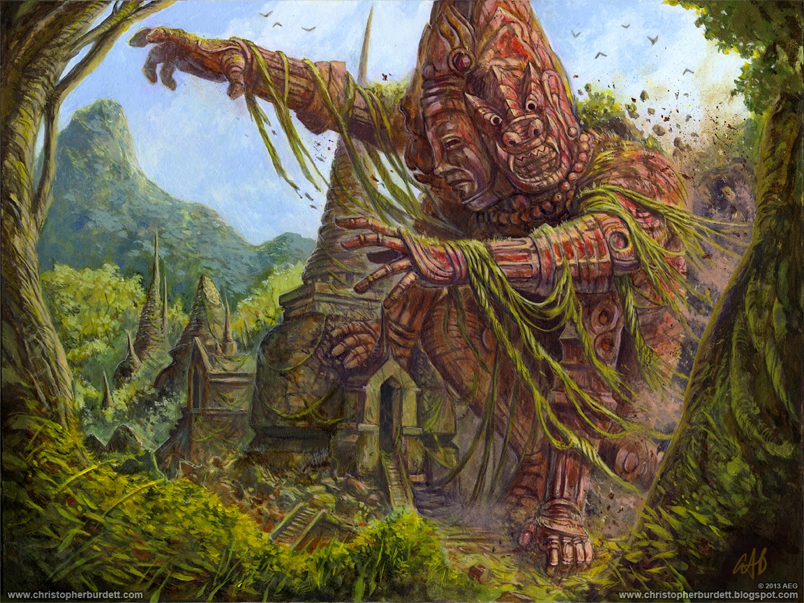 Like every other pieces that I create the Lost Colossus began with a thumbnail stage. Unlike the rest of the pieces I create there was pretty much just ONE thumbnail that I was working with. I REALLY knew what I wanted to do with this piece and before sketching I took a ton of reference photos that I cobbled together to make myself into a four armed three faces giant statue. I really don't recommend doing just one thumbnail... but I have had a really great working relationship with Adrian over at AEG and I was confident that I was moving in the right direction with this piece. I spent a lot of time working out the concept to make sure it was the way I wanted it before turning it in...